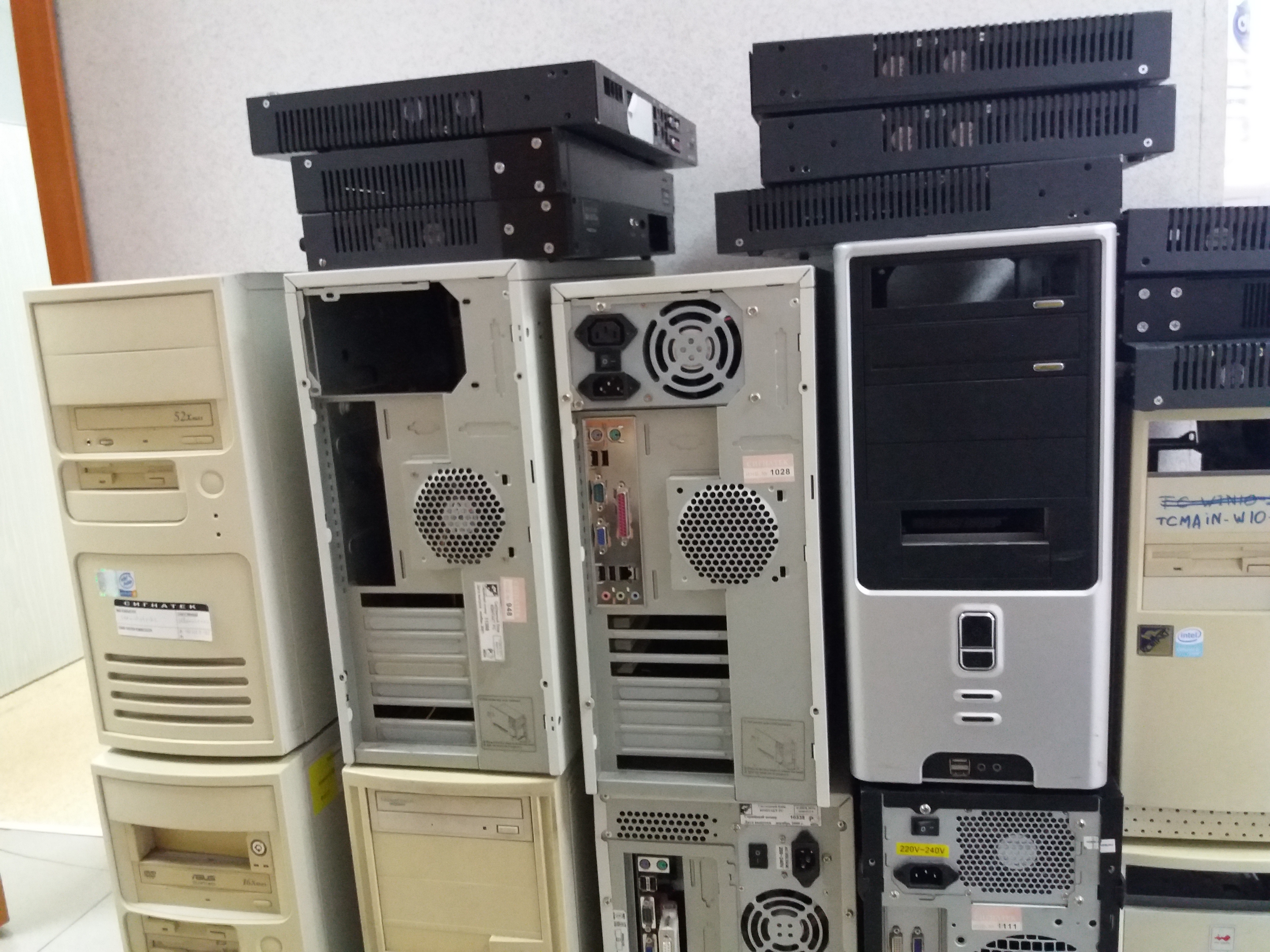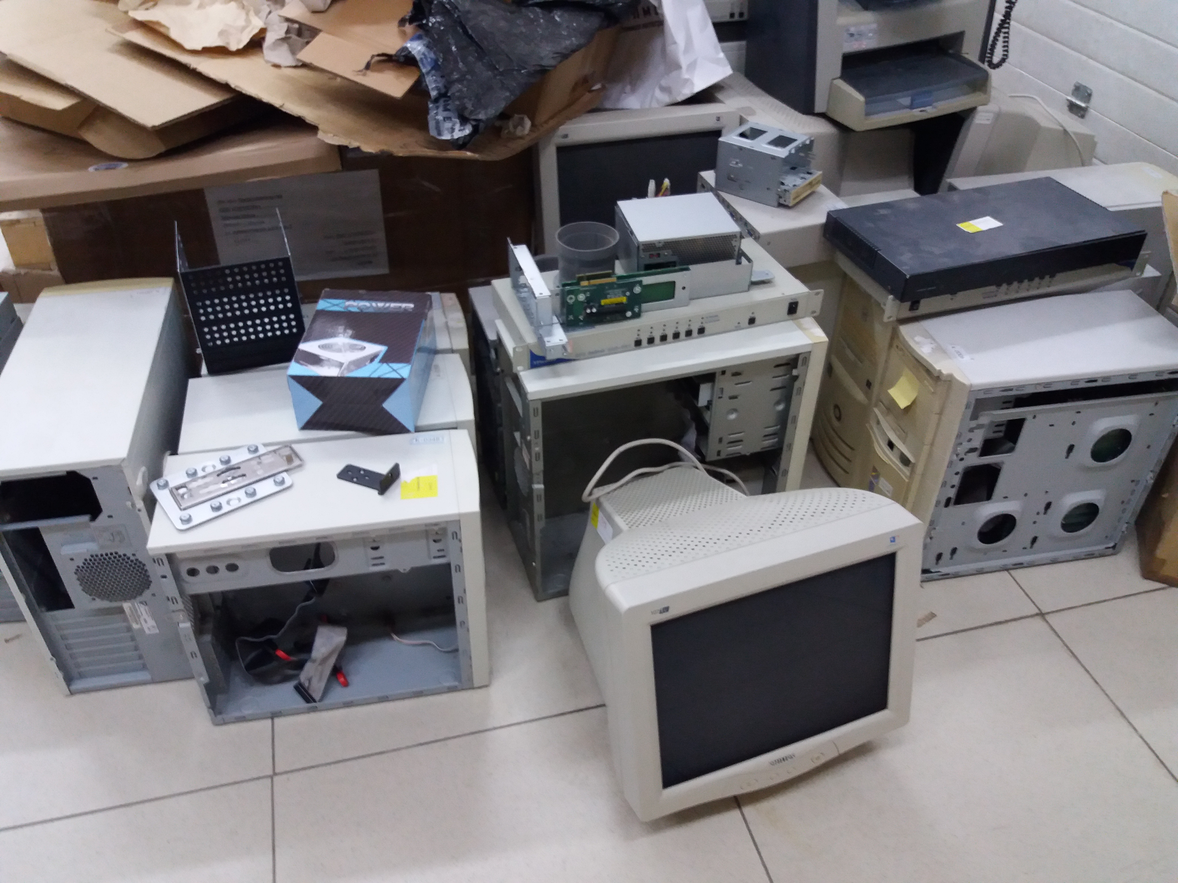 Наводим в конторе порядок. И вывозим в утиль весь хлам, оставшийся от компьютерной техники. Всё списаное, б\у, Есть старое, есть свежее, но не старое. Нерабочие (требующие ремонта) - мониторы, принтеры, факсы, комплектующие к процессорам, серверу, корпуса, платы и т.д.