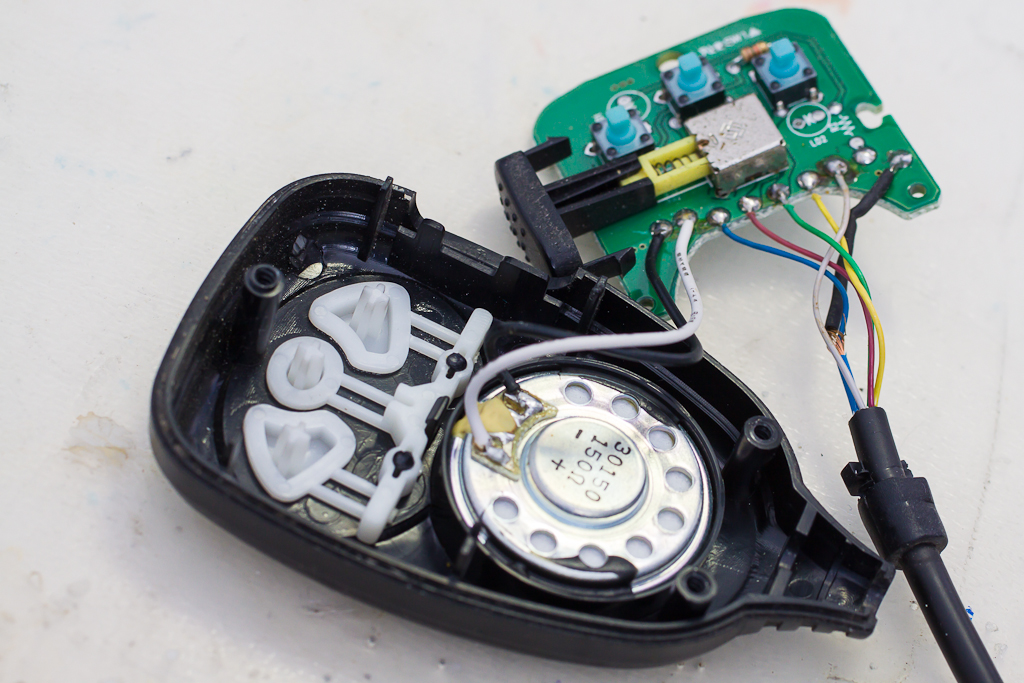 Нужно отпаять провода от динамика-микрофона, выковырять его из корпуса и отпаять провод, в этом случае - синий (может быть любого другого цвета)