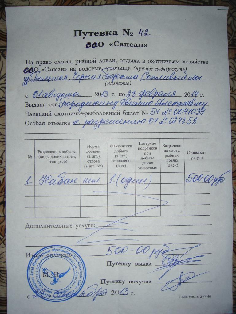 Если кого будет интересовать - есть контакт охотоведа в Базое. В окрестностях Базоя немерено тетерь. Подпускают - только что не руками ловить можно. Путёвка, если есть билет росохотрыболовсоюза, сезонная (до 28.02) - 2500 на вид, 3500 - на все виды (кроме лицензируемых). Также имеются на мишку (кажется, 8, но взять не могут), на лосика (если память не подводит, 30). Со слов охотоведа, на заю еще рано сильно открывать, не поднялся он еще даже... Но коммерческая заинтересованность выше природоохранных мыслей.