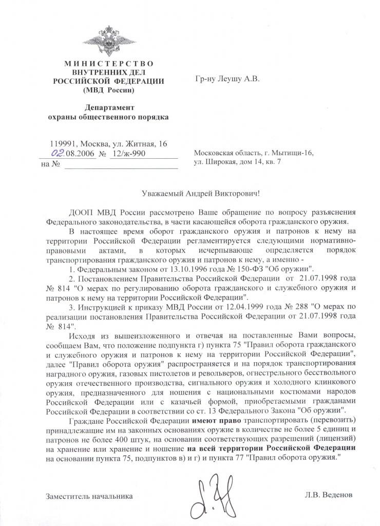 Не путайте людей! Не заводите смуту! Приказ который вы даете, лишь устанавливает регламент для сотрудников МВД то есть то что им делать, если к ним обратились с заявлением о выдаче разрешения, но ни в коей мере не оговаривает правил перевозки, транспортировки.Комсомолец писал(а):max, Приказ №509 от 14 мая 2012 г.Читайте внимательно,распространяется на юридические лица и физическое лицо.