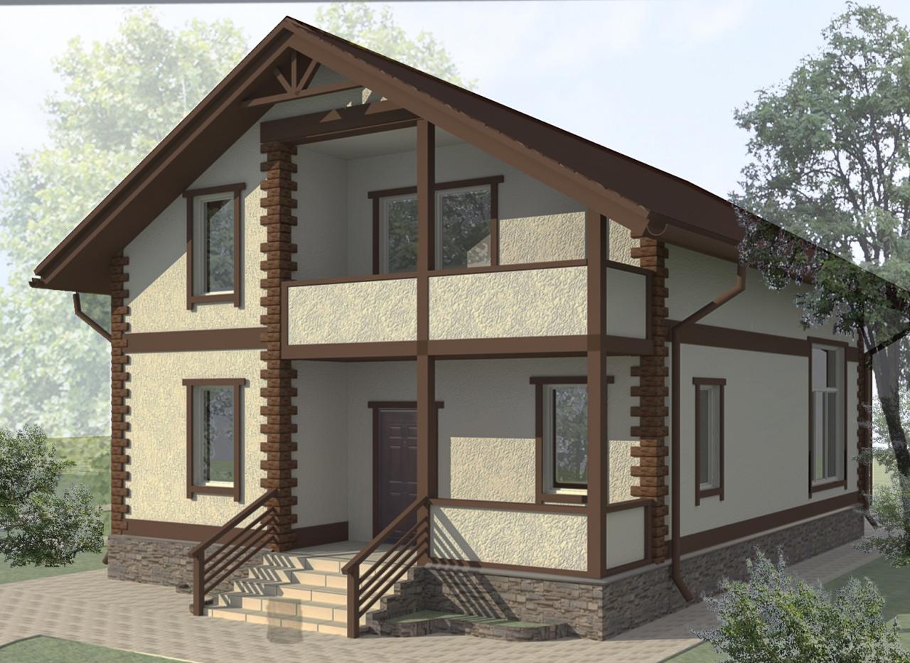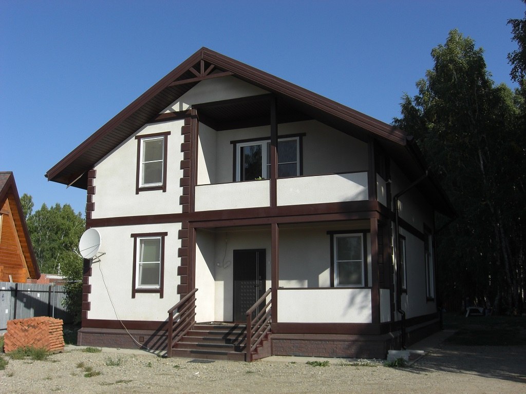 Фасад 500 тр. Вданном случае пробковая напыляемая штукатура и декор. элементы из ППС.