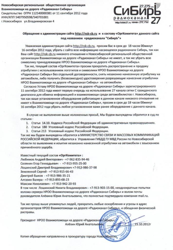 Дежурный (с его слов) с Админом получают свидетельство о регистрации "Новосибирская региональная общественная организация Взаимопомощи на дороге «Радиоканал Сибирь»" ИНН 5407950598