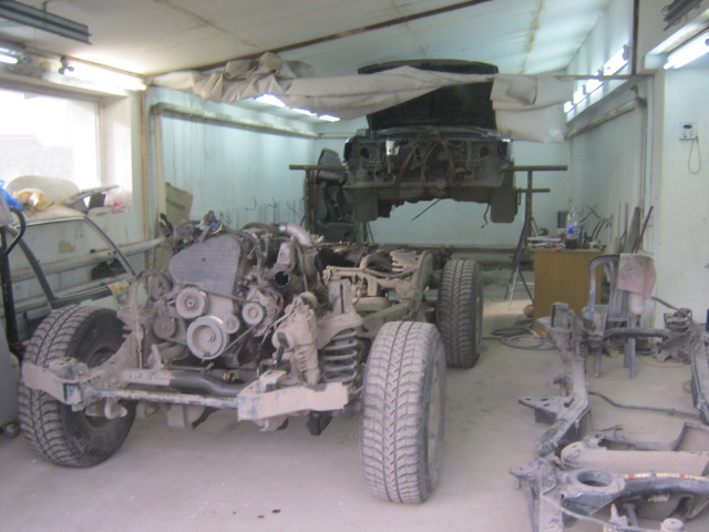 Снимаем оба бампера, фары, решётку радиатора, сливаем все тех. жидкости, отсоединяем всё от двигателя в моторном отсеке: топливные трубки, охлаждение, печку, проводку, рулевой вал от редуктора, гидроусилитель, кодиционер: Снимаем правое переднее колесо, снимаем защиту, отсоединяем тормозные трубки и трубку сцепления и проводку датчика ABS: Снимаем левое переднее колесо, снимаем защиту, отсоединяем тормозную трубку, датчик ABS, трубки сапунов коробок: Снимаем заднее правое колесо: Снимаем защиту, отсоединяем топливные трубки от бака к горловине: Отсоединяем проводку на раме и ручник: Тщательно три раза проверяем всё ли отсоединили, откручиваем кузов от рамы и начинаем подъем, ВИРА ПО МАЛУ: Продолжение следует.....