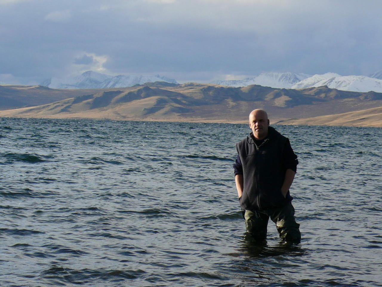 На перевале Калачан Рыболову пришлось придержать упорно не желавший позировать флажок. С перевала открывается вид на тывинское высокогорье, на горный массив Шибэту и вершину Цаган-Шувут-Ула, которые находятся уже на территории Монголии. На спуске с перевала открывается изумительный вид на одно из крупнейших озер Монголии Убс-Нур.